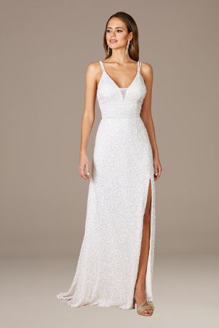 The intricate beading on this full-length spaghetti-strap gown brings a touch of romance to the sexy, figure-hugging silhouette and high-leg slit.