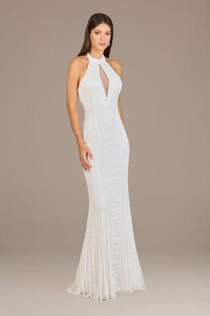 A simple silhouette meets extraordinarily detailed beading, perfect for the modern, sophisticated bride. Emphasize your alluring side with a halter neckline and entrancing illusion keyhole cutout and a skimming sheath design.