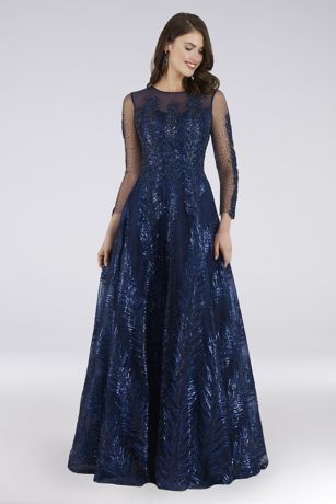 Shimmering crystals, luxurious lace, and ornate appliques adorn this ball gown from high neckline to flowing sweep train. Illusion mesh sleeves add a bit of of-the-moment detail.