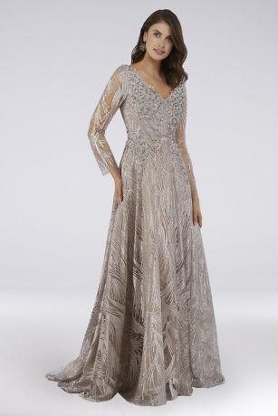Lara Long Sleeve Beaded Lace V-Neck Ball Gown