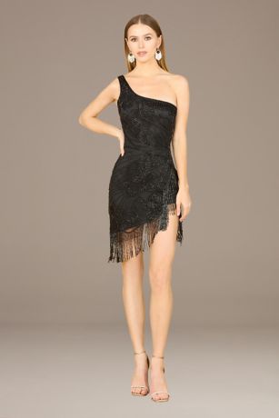 With every step, beaded fringe creates stunning movement for your big entrance. The one-shoulder neckline and asymmetrical hem balance one another for an intriguing silhouette, complete with intricate allover beading that'll secure all eyes on you!