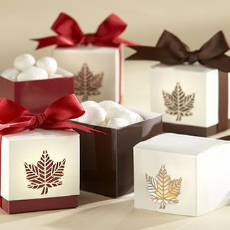 When only casual elegance will do, you'll find exactly what you're looking for in this smartly crafted, two-toned favor box with striking accents that convey the essence of autumn. The laser-cut leaves on sides of the cream-colored favor box top enhance the classic design, putting your fall event a step closer to perfection. This favor box features slip-on top and satin bow. The laser-cut maple leaves allow bottom box color to show through. Fill with your favorite chocolate or candy treat. Measures 2" square and some assembly is required. This item is Sold as a Set of 24.