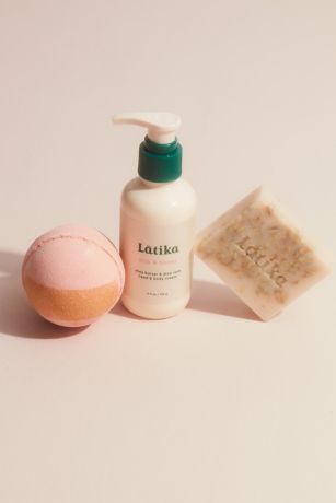 - Three-piece set includes body cream, bar soap, bath bomb