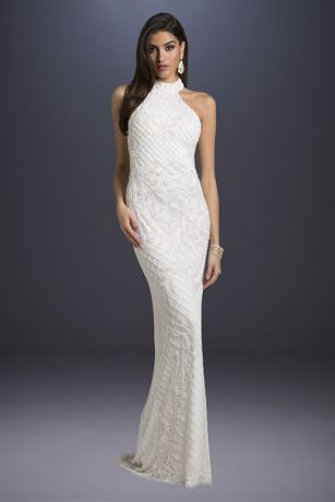 Tonal beading creates glamorous lattice and floral patterns atop this body-skimming sheath wedding dress. Complete with a halter neckline and a cascading detail.