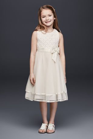 A pretty mix of textures for the littlest lovely in your wedding party, this tank dress features a beaded, quilted bodice and tiers of satin-edged tulle.
