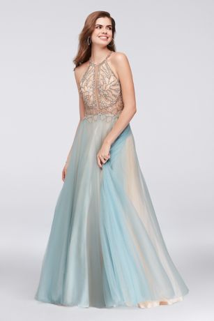 Layers of aqua and nude tulle create a dreamy cloud of color on the skirt of this intricately detailed ball gown. The illusion lace bodice is encrusted with beading, sequins, and rhinestone for unbelievable sparkle.