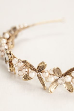 - Gold leaf headband adorned with crystal and pearl accents.