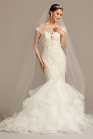Amazing dimension comes through this elegant mermaid wedding dress. The lace background is stitched with linear beading then overlaid with scrolling appliques. Nude illusion fabric creates a neckline that plunges to the navel and makes it look as though the lace applique cap sleeves are floating on the tips of your shoulders. The bodice is finished with a lace-up corset back and is paired with a light and airy ruffled organza skirt.