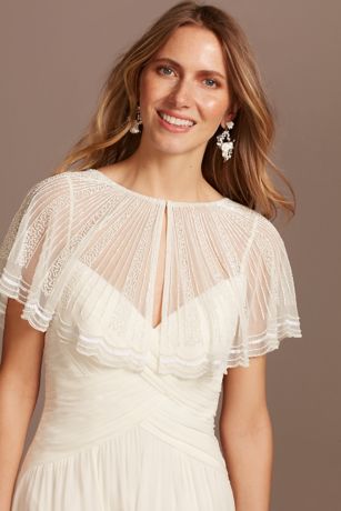 Made with over 10,000 beads and sequins, this lightweight tulle capelet is a beautiful way to add coverage to a bridal look, while still showing off her wedding dress. The hand-beaded linear pattern and the sweet scalloped edge give the piece beautiful texture.