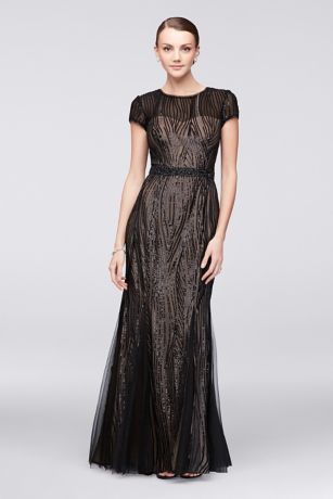 Sleek linear sequins and a brilliantly beaded waistline give this short-sleeve mesh gown tons of starry sparkle. Mesh godet add graceful movement to the mermaid skirt.