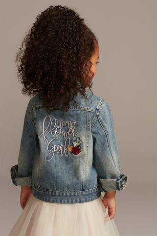 Here she comes! The youngest member of the bridal party will love flaunting her title in her "Little Miss Flower Girl" floral embroidered denim jacket.