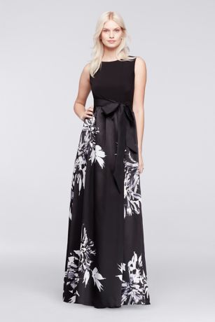 Bright cherry blossoms pop against the dark backdrop of this full long A-line mother of the bride dress. The solid tank top grounds the look, and a bow at the waistline ties it all together.