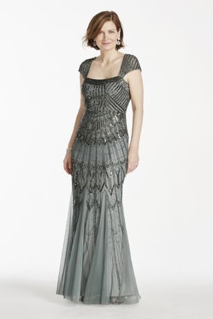 - Cap sleeve gown with square neckline and envelop back features dazzling all over beading.
