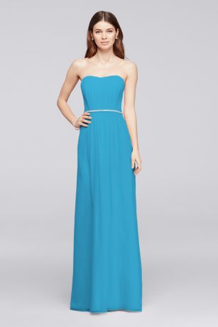 Vertical pleating adds a formal element to this long strapless chiffon bridesmaid dress. The beaded belt lends just a hint of shine.
