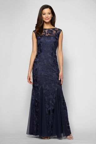 This long tulle dress is a lovely choice for the mother of the bride and wedding guests. Soutache ribbon flowers bloom the length of the gown, while hemline godets make the skirt move gracefully.