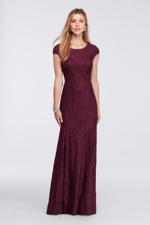 On this long dress with cap sleeves and a scoop back, lace skims curves with an air of elegance.