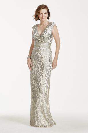 - Floor length lace dress with back slit features scalloped detailing along the cap sleeves and v-neckline.