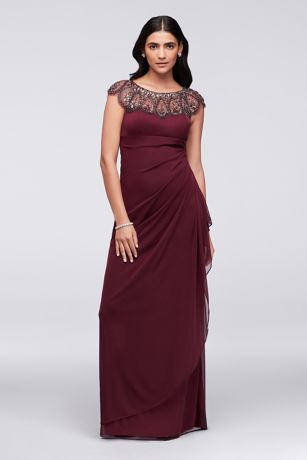 Gorgeous teardrop beading dresses up the cap-sleeve neckline on this long, smartly side-draped look, perfect for Mom or any special guest.