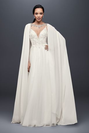 This trailing chiffon cape delivers dramatic flair, with intricate jeweled accents at the neckline and a ribbon that ties in the back.