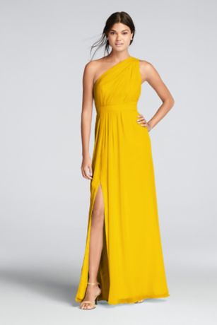 You'll love the feel of crinkle chiffon on this flowy floor-length bridesmaid dress with a one-shoulder neckline and an elegant skirt slit.