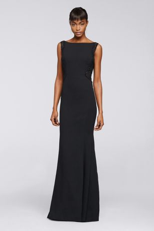 Linear sequins flow along the side illusion panels on this floor-length trumpet dress with an alluring low back.