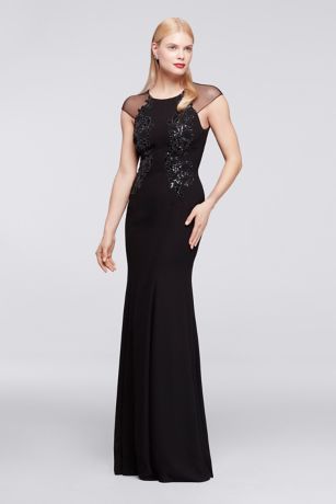 Statement appliques adorn the bodice of this gala-ready crepe dress with sheer illusion cap sleeves and a skirt that glides across the floor.