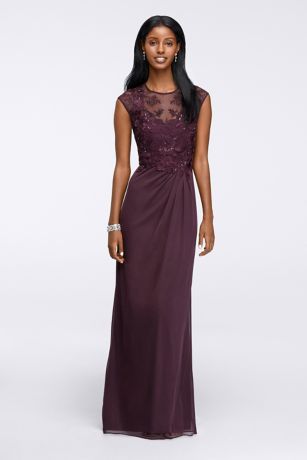A lavishly embroidered bodice with cap sleeves and lace illusion neckline lends an air of retro glamor to this fit-and-flare gown with flowing matte jersey chiffon skirt.