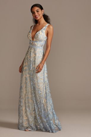 This embroidered mesh dress will add glamour to the dance floor with its deep-V illusion neckline and long A-line skirt.