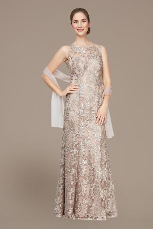 From its high illusion neck to the A-line skirt, allover embroidery makes this floor-length gown a beautiful option for your next occasion. A matching chiffon shawl completes the look.
