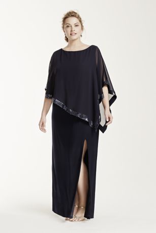 - Sleeveless jersey bodice features chiffon caplet top with sequin trim.