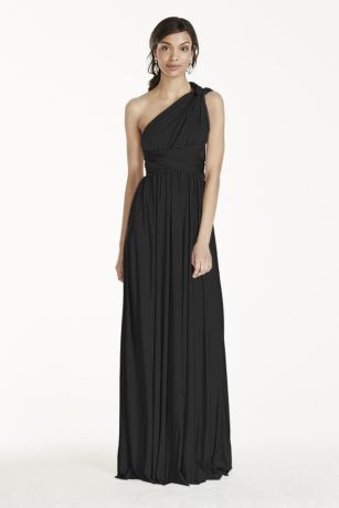 The options are endless with this versatile floor-length jersey convertible bridesmaid dress. Two front ties create different necklines, depending on how you twist and tie them, letting each bridesmaid style it her way.