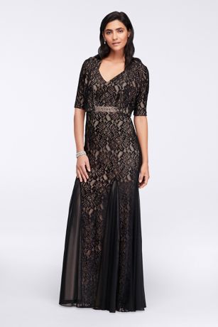 A dramatic lace dress, complete with a crystal-accented waist and fluid hemline insets. The cropped jacket provides chic coverage when the occasion calls for it.
