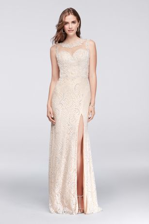 The romance of lace, reimagined in a sophisticated silhouette. Slip into this lacy column gown, complete with illusion insets at the neckline and back; the slit skirt lets you dance all night without skipping a beat. This style is exclusive to David's Bridal.