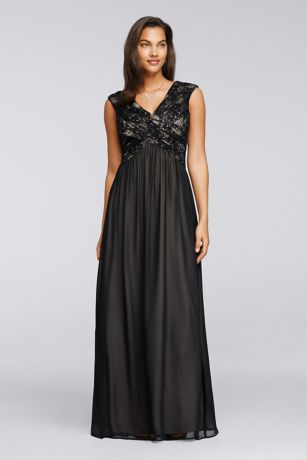 - Black nude lace with cap sleeves and v-neckline features sparkling sequins on bodice.
