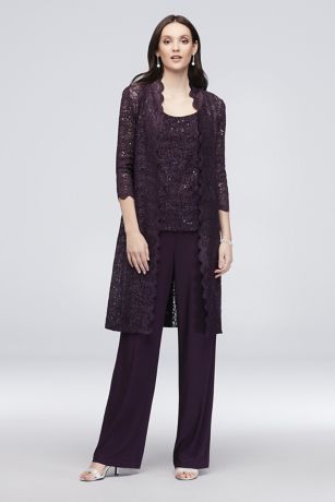 A long, sequined lace jacket, paired with a matching lace shell and wide-leg chiffon pants, creates an elegant silhouette for the mother of the bride or groom.