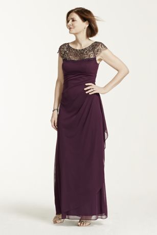 - Cap sleeve bodice features heavily beaded illusion neckline.