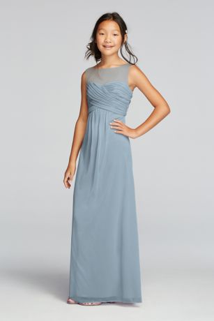 A nice choice for your junior bridesmaids: This long mesh sleeveless bridesmaid dress with an illusion neckline is the right mix of cute and grown-up.