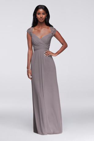 The bodice of this long mesh bridesmaid dress is a thing of beauty: It features a faux surplice front, lace cap sleeves, and a dramatic keyhole back.