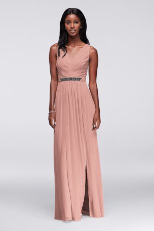 Tiny pyramid beads dazzle at the waist of this modernly pleated, V-neck mesh bridesmaid dress.