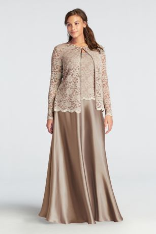 - Sleeveless stretch lace bodice with long sleeve lace jacket that features a pearl and rhinestone necklace around the collar.