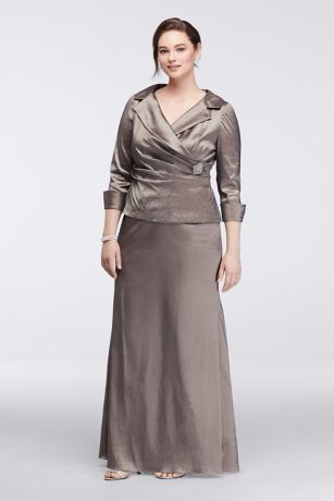 Classic and elegant, this mock two-piece taffeta dress is infused with stretch for a lovely drape and a flattering fit. It's tailored with a wide lapel that beautifully frames your face, cuffed three-quarter sleeves, and a dazzling rhinestone pin at one side.