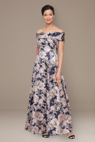 Slip into elegance with this stunning off-the-shoulder ballgown, a gorgeous floral jacquard print that takes center stage. The stretch fabric moves with you, while the voluminous skirt makes a dramatic entrance at any special occasion. Whether you're celebrating as Mother of the Bride, Mother of the Groom, or there to celebrate in style, this gown delivers timeless sophistication with a modern twist. Plus, hidden pockets mean you can actually keep your essentials close!