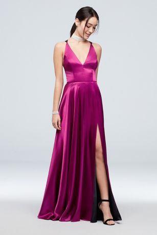 This slinky satin dress features a deep V-neck, a multicolored strappy back, and a front slit for showing off your fanciest footwear.