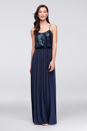 Get glowing in this long bridesmaid dress, fitted with spaghetti straps, a sequin-bedecked blouson top, and a long, soft georgette skirt. The removable sash can be tied at the front, back, or side, depending on your mood.