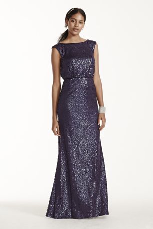 This versatile and stunning all-over sequined blouson sheath gown features with cap sleeves and a dramatic V-back.