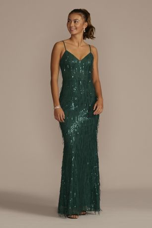 Old Hollywood glam meets youthful radiance on this showstopping sheath dress. Channel flapper fun with sequin fringe that sways with your every step, and matches your imminent prom queen crown.