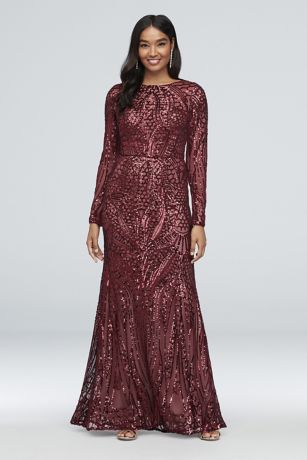 We only have one word for this mermaid gown: Wow. The high neckline and long sleeves make extra room for the eye-catching allover sequin motif, while the low back creates another alluring detail.