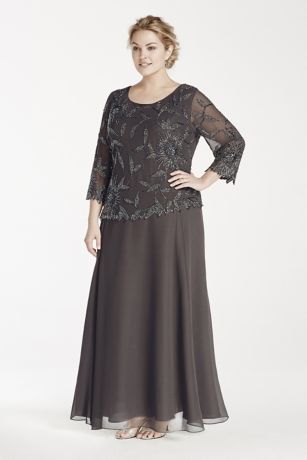 - Long two piece chiffon dress with round neckline features long sleeve top with a floral beaded pattern and asymmetrical hem.