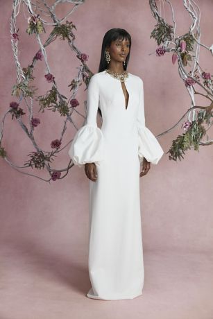 Elegant and refined, this crepe gown features a keyhole neckline adorned with beaded jewel embellishments and puffed sleeves for a touch of drama. Perfect for a sophisticated statement at your wedding or a formal event.