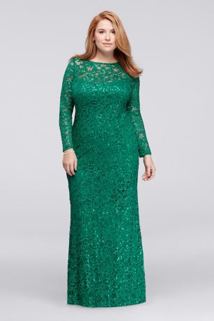 Make a regal entrance in this allover sequin lace dress with ladylike illusion long sleeves.